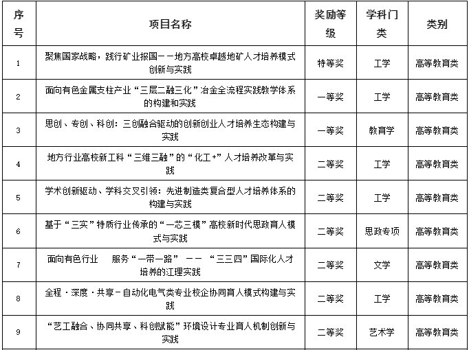 我校此次获奖名单中,高等教育类(本科层次)成果分别是由邱廷省教授负责的《聚焦国家战略,践行矿业报国——地方高校卓越地矿人才培养模式创新与实践》荣获特等奖;由温和瑞教授负责的《思创、专创、科创:三创融合驱动的创新创业人才培养生态构建与实践》、肖燕飞教授负责的《面向有色金属支柱产业“三层二融三化”冶金全流程实践教学体系的构建和实践》等2项成果荣获一等奖;由帅词俊、邓晓宇、李立清、龚姚腾、于仲安、刘玉宝等人负责的6项成果荣获二等奖。获奖成果分布在5个学科,其中工学5项,教育学1项,艺术学1项,文学1项,思政专项1项。