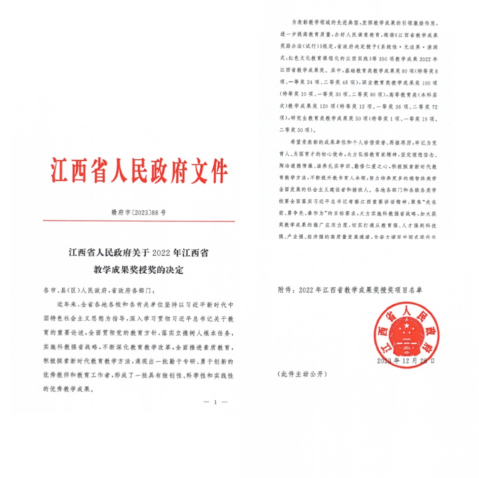 本网讯 近日,江西省人民政府下发通知,正式公布了2022年江西省教学成果奖获奖名单。我校喜获教学成果奖14项,其中高等教育类(本科层次)特等奖1项,一等奖2项,二等奖6项。研究生教育类一等奖3项,二等奖2项,获批数量位列全省前列。