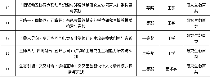 研究生教育类获奖成果分别是由温和瑞教授负责的《三统一,四协同,五路径:有色金属领域专业学位研究生培养模式构建与实践》、何桂春教授负责的《“四驱动五协同六联动”资源与环境领域研究生协同育人体系构建与实践》和杨杰教授负责的《“需求导向、多元协同”电类专业学位研究生培养模式创新与实践》等3项成果荣获一等奖;由吴彩斌教授负责的《三师合力四地融合五环协同:矿物加工研究生工程能力培养与实践》和黄金发教授负责的《生态引领·交叉融合·多维互动:交叉型创新设计人才培养模式探索与实践》等2项成果荣获二等奖。获奖成果涵盖了学校矿业、冶金、材料、化学、资源与环境、电气和设计类等学科。