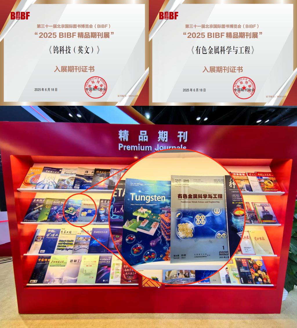 本网讯 近期,第三十一届北京国际图书博览会(BIBF)在北京国家会议中心举办。我校主办的中英文期刊《钨科技(英文)》《有色金属科学与工程》以“‘十四五’中国期刊精品回顾”为参展主题申报,双双入选本届博览会“2025中国精品期刊展”。其中,《钨科技(英文)》自去年首次入选“2024BIBF精品期刊展”后,再次成功入选“2025BIBF精品期刊展”,连续两年作为入展期刊在博览会上展出。《有色金属科学与工程》为首次入选此届博览会进行展出。