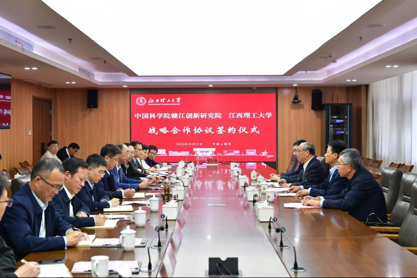本网讯 10月31日,我校与中国科学院赣江创新研究院战略合作协议签约仪式在我校三江校区濂溪楼举行。赣江创新研究院党委书记齐涛、副院长廖伍平,中国工程院院士、校长葛世荣,江西省政协常委、人口资源环境委员会副主任、赣南实验室执行主任杨斌,校党委副书记徐志峰,副校长熊志华、汪航、宁洁出席会议,会议由徐志峰主持。
