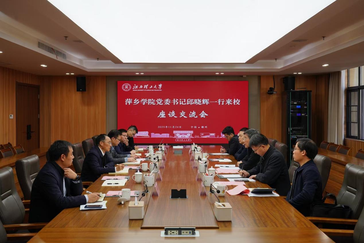 本网讯 11月24日,萍乡学院党委书记邱晓辉、萍乡学院副校长吴代赦一行来访。校党委书记刘祖文,校党委常委、副校长熊志华会见来宾并召开座谈交流会,相关部门负责人参加会议。