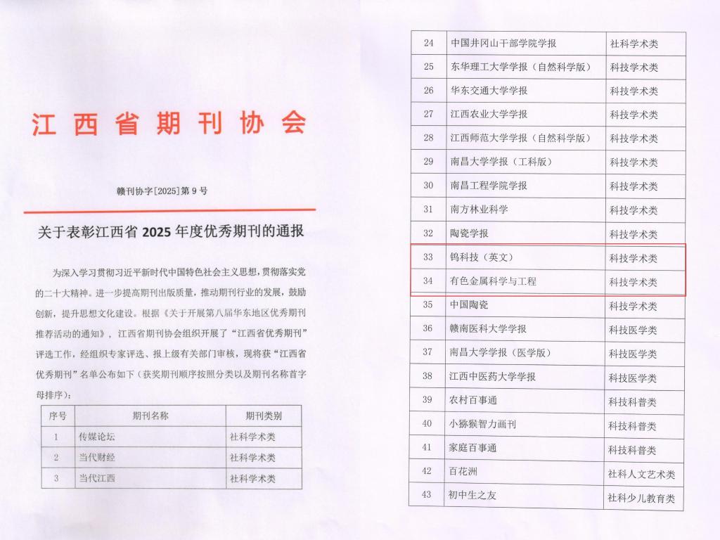 本网讯 近日,江西省期刊协会正式发布通报,我校主办的《钨科技(英文)》《有色金属科学与工程》两本期刊在经过多轮评选后,共同获评“第八届华东地区优秀期刊”和“2025年度江西省优秀期刊”两项荣誉。