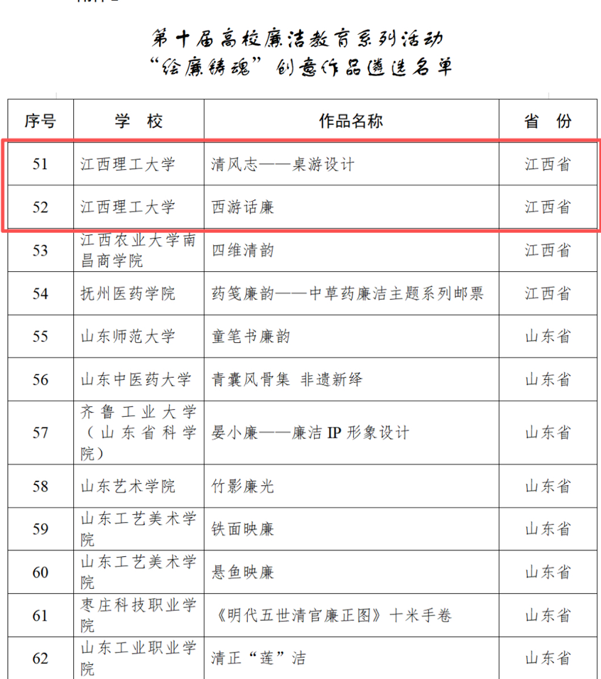 本网讯 近日,教育部以“清风育德守初心 廉洁笃行担使命”为主题组织开展了第十届高校廉洁教育系列活动本并公布活动遴选结果。我校共有3件作品成功入选,入选数量位列江西省高校第一,充分展现了学校在廉洁文化建设和思想政治教育工作中的扎实成效与突出实力。