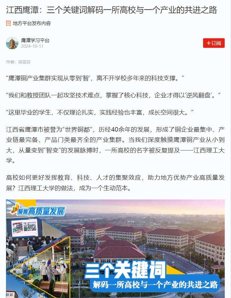 与鹰潭市人民政府、江西铜业集团等多方共建先进铜产业学院,催生出又一个国家级创新载体,将校地企三方合作向纵深推进了一步。