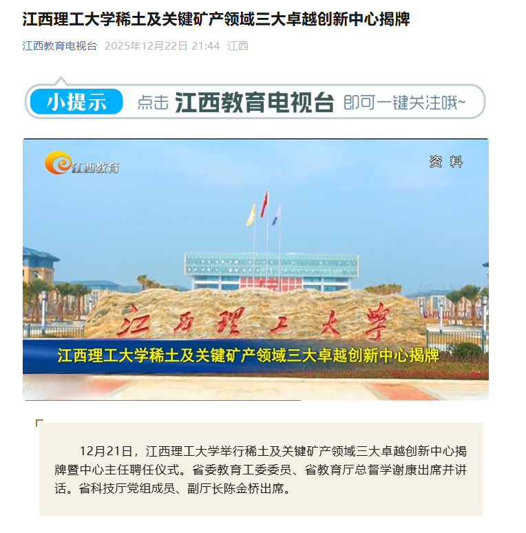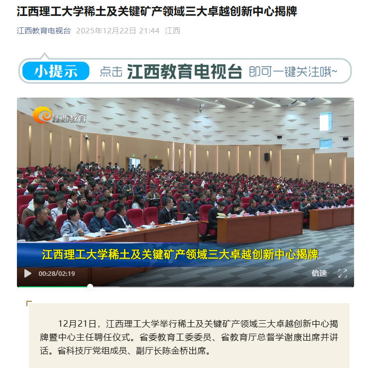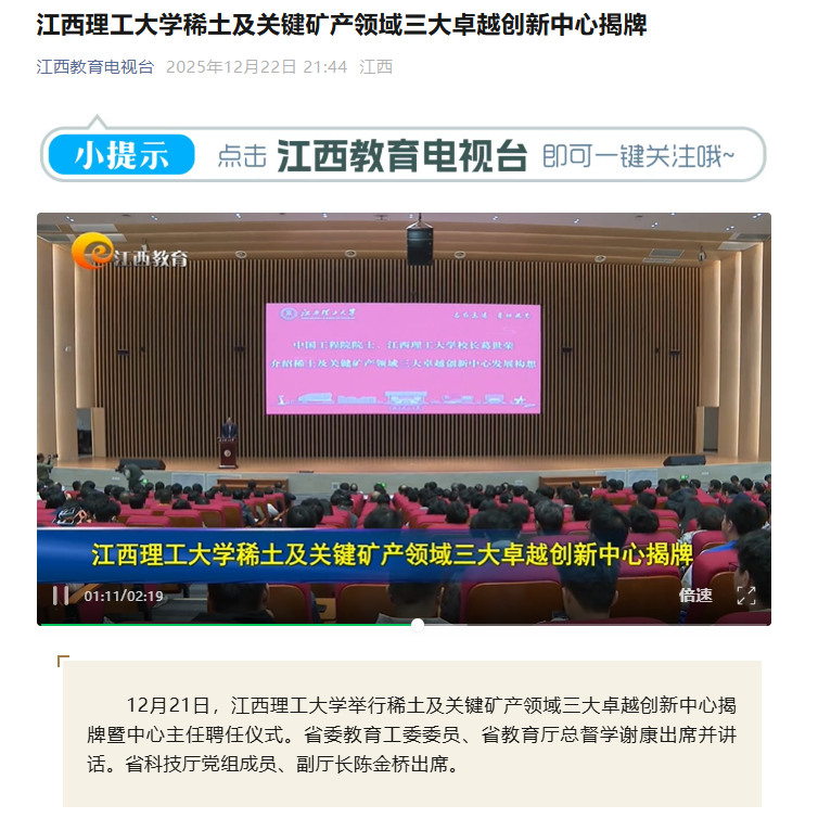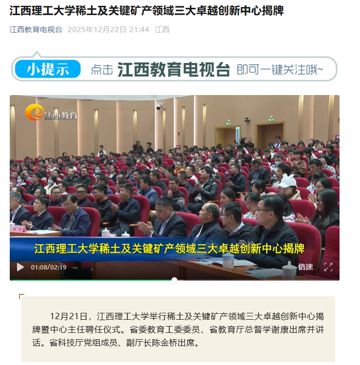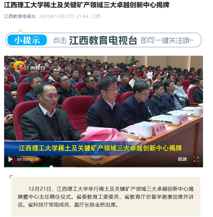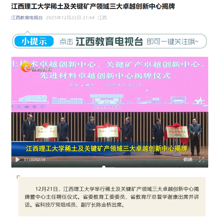 12月21日,乳头高潮-女性乳头高潮 举行稀土及关键矿产领域三大卓越创新中心揭牌暨中心主任聘任仪式。省委教育工委委员、省教育厅总督学谢康出席并讲话。省科技厅党组成员、副厅长陈金桥出席。