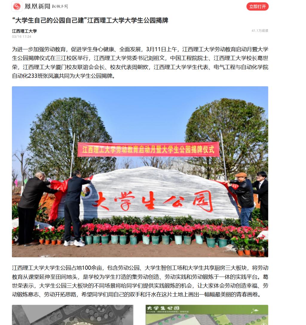 大学生公园占地100余亩,包含劳动公园、大学生智创工场和大学生共享厨房三大板块,将劳动教育从课堂延伸至田间地头,是学校为学生打造的集劳动创造、劳动实践和劳动锻炼于一体的实践平台。葛世荣表示,大学生公园三大板块的不同场景将给同学们提供实践锻炼的机会,让大家体会劳动创造幸福、劳动锻炼意志、劳动开拓思路,希望同学们用自己的双手和汗水在这片土地上画出一幅幅最美丽的青春画卷。