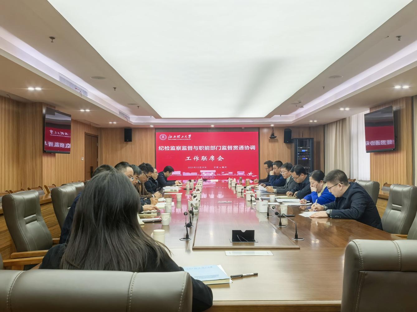 本网讯 12月18日,我校召开纪检监察监督与职能部门监督贯通协调工作联席会。校党委常委、纪委书记、监察专员刘飞,校党委常委盛晓明、汪锋锁出席会议,相关职能部门负责人参加会议。