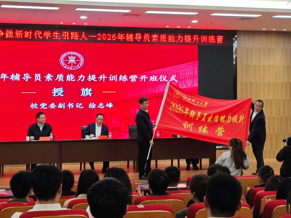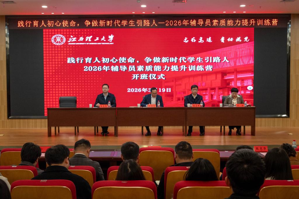 本网讯 3月19日,我校2026年辅导员素质能力提升训练营在三江校区图书馆报告厅正式开营。校党委书记刘祖文,校党委副书记徐志峰,校党委常委、副校长熊志华、宁洁出席会议。党委研究生工作部、党委学生工作部、国际教育学院相关人员及全体专兼职辅导员参加会议。南昌校区各学院、先进铜产业学院同步视频参会。会议由校党委常委、副校长宁洁主持。